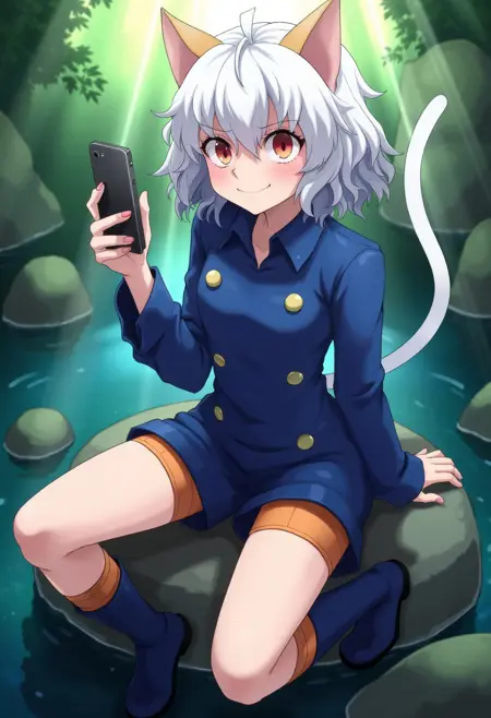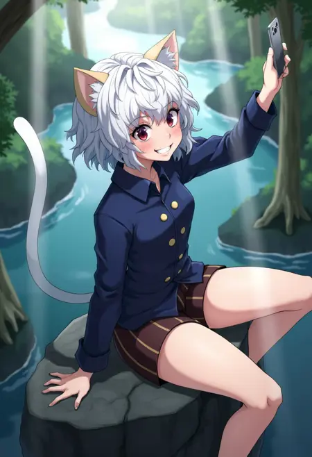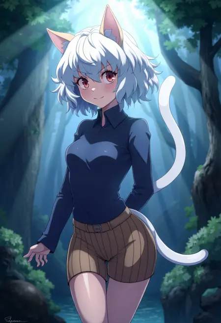 "Hunter x Hunter"의 Neferpitou로, 짧고 곱슬적이거나 물결친 흰색 머리카락과 붉은 눈을 가지고 있으며, 고양이처럼 인체화된 베이지색 귀와 단 하나의 흰색 고양이 꼬리를 가지고 있습니다. 각 손에는 4개의 손가락과 발톱 또는 발톱 모양의 매니큐어가 있으며, 노란색 단추가 달린 파란색 긴 소매와 주황색 세로 줄무늬가 있는 주황색 무릎까지 오는 바지, 주황색 세로 줄무늬가 있는 무릎 양말, 그리고 파란색 부츠를 착용하고 있습니다.