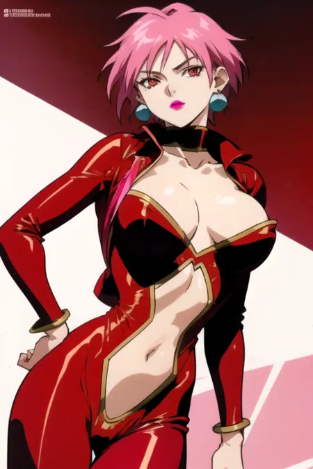 PanniFatal, 1girl, solo, short hair, large breasts, red eyes, long sleeves, navel, cleavage, jewelry, bodysuit, pink hair, red hair, earrings, red leotard, highleg leotard, lipstick, center opening, navel cutout