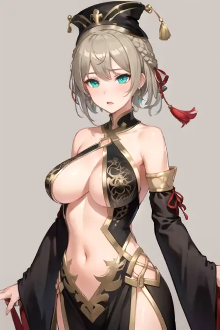 | トレーニングワード | PVanilla, 1girl, solo, short hair, large breasts, hair ornament, black headwear, black dress, navel, cleavage, bare shoulders, jewelry, green eyes, earrings, detached sleeves, aqua eyes, underboob, center opening, side slit, crown braid コピーしました! |