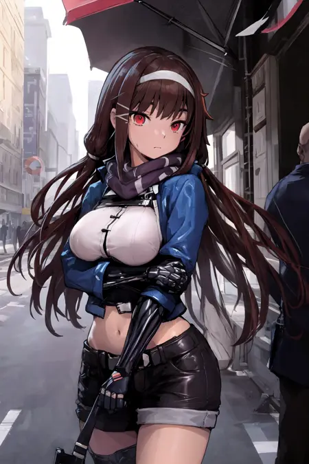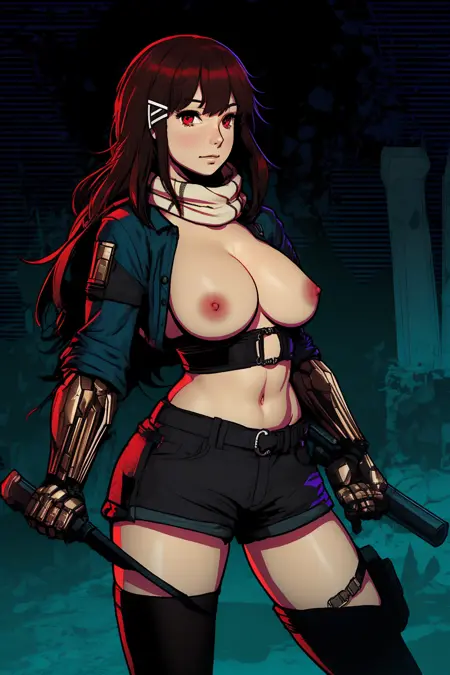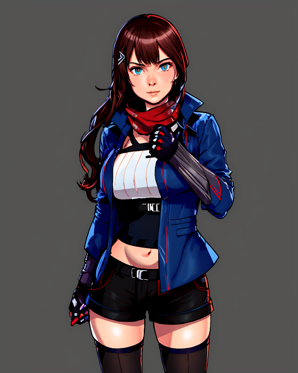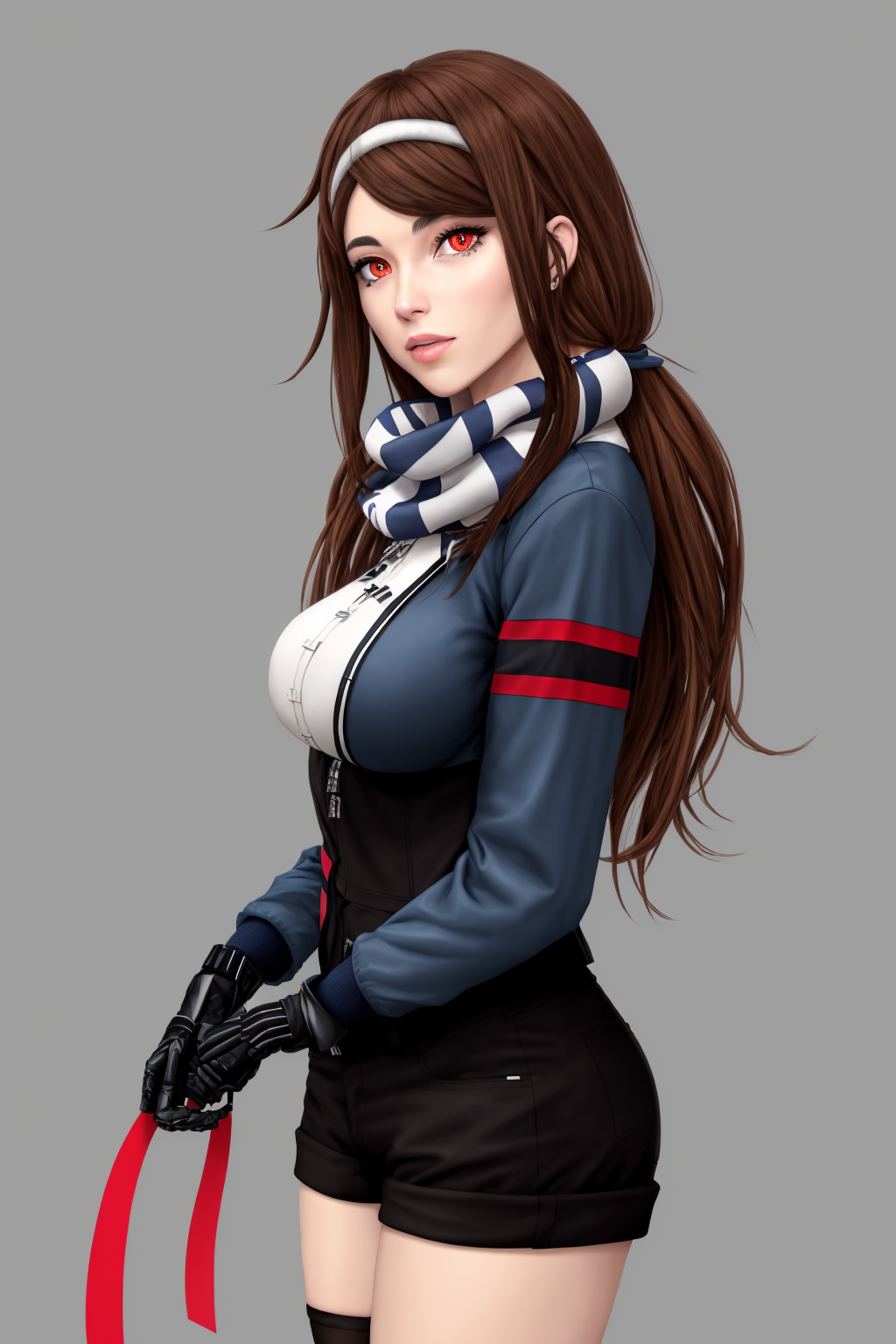 额外提示词:机械臂,义肢手臂,红眼睛,蓝色夹克,灰色围巾,白色衬衫,紧身衣,短短的短裤,不规则的腿部服饰,突出的胸部,过膝袜