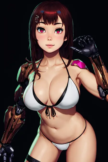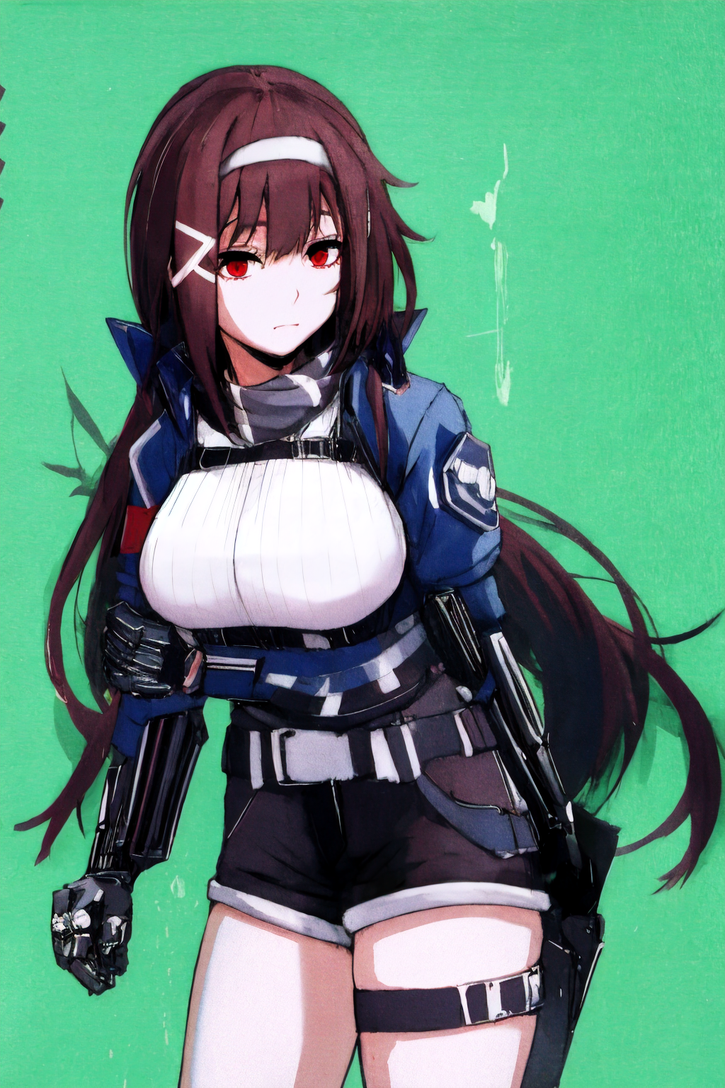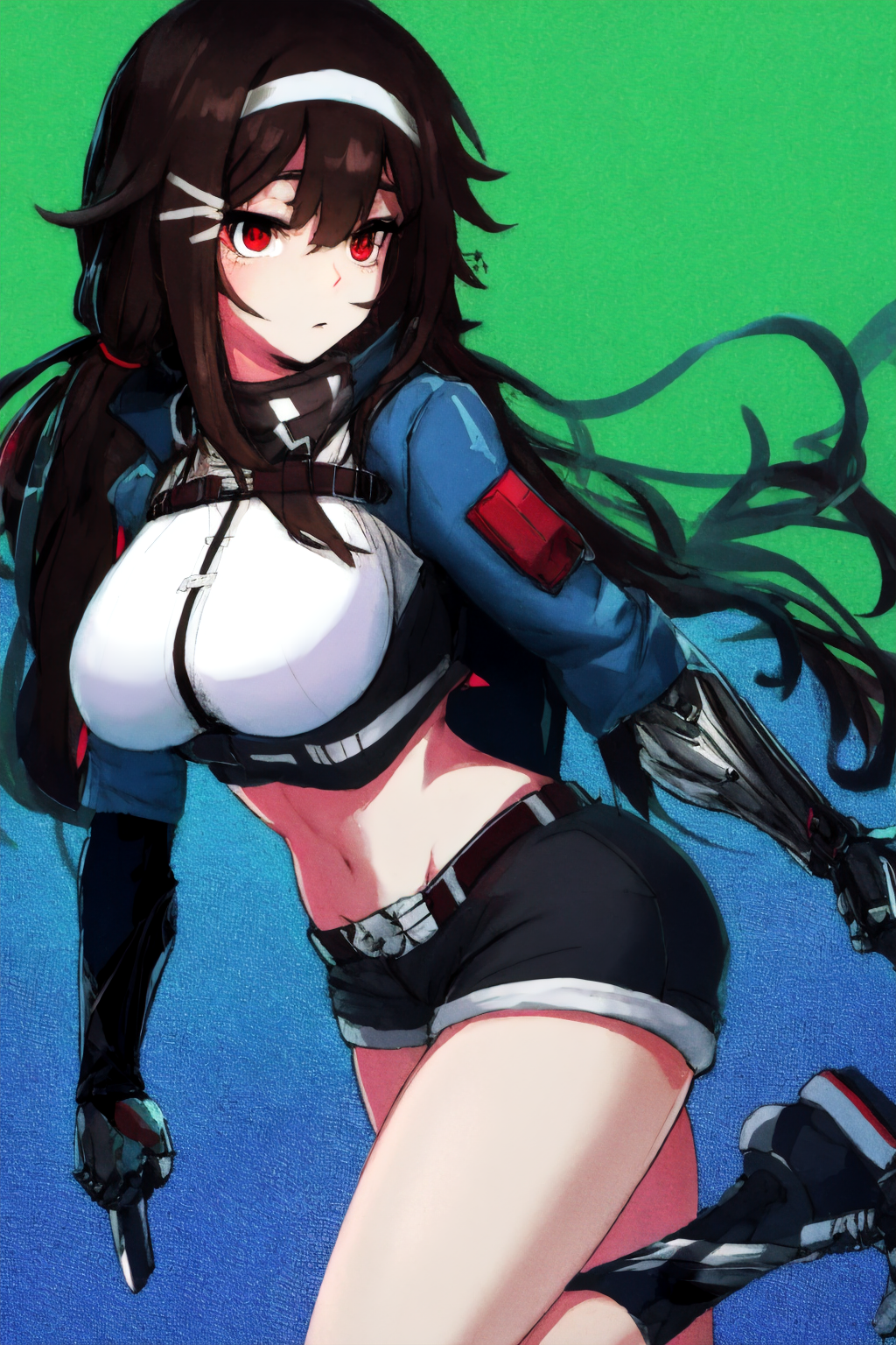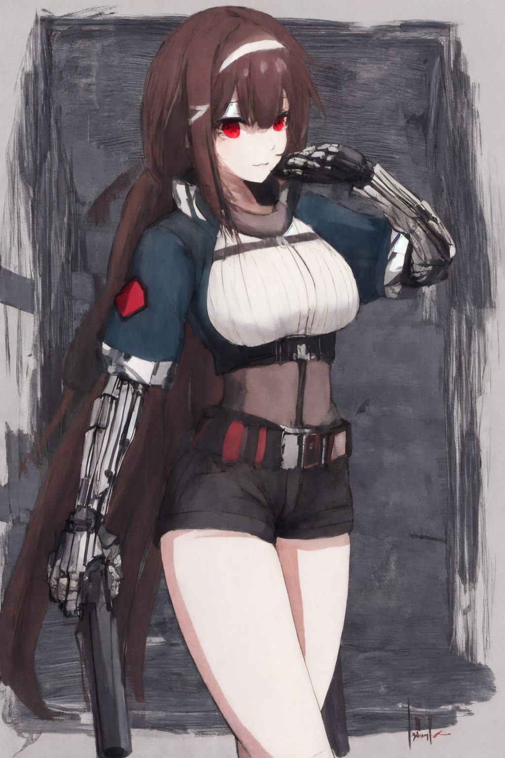 额外提示词:机械臂,义肢手臂,红眼睛,蓝色夹克,灰色围巾,白色衬衫,紧身衣,短短的短裤,不规则的腿部服饰,突出的胸部,过膝袜
