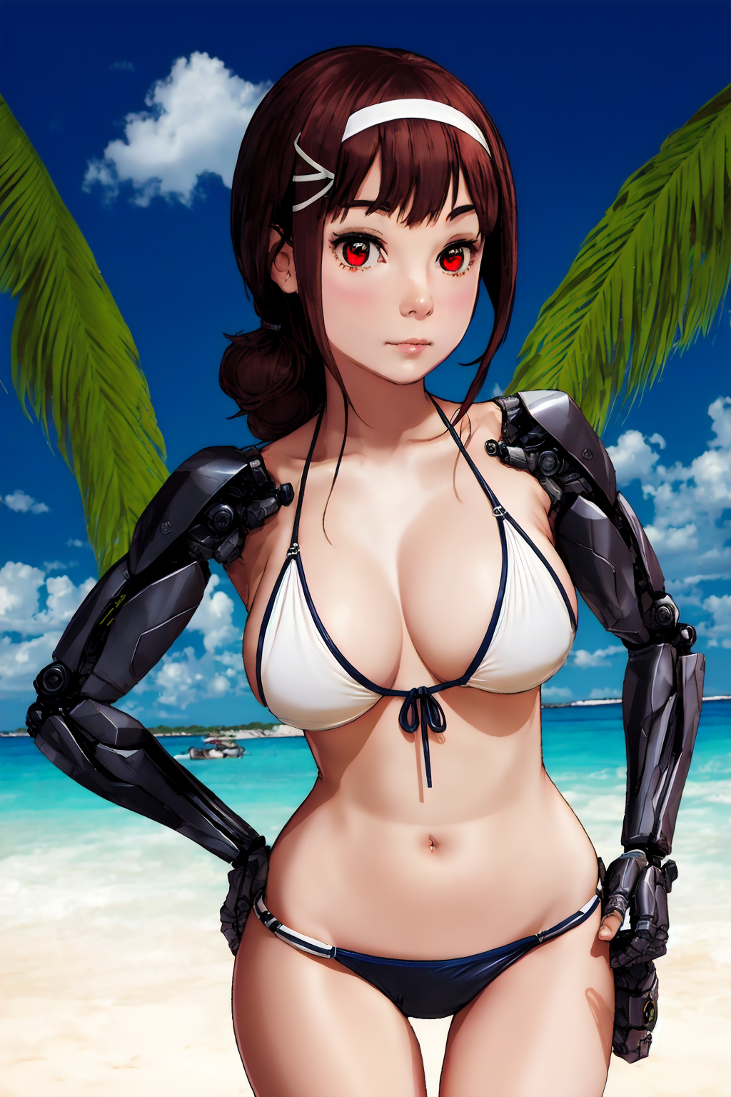 额外提示词:短短的短裤,泳衣,开口短裤,白色比基尼,前面系带比基尼上衣,前面系带上衣,紧身衣,太阳镜