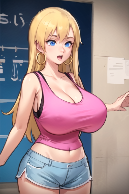 RoxxySummertimeSaga, 1girl, solo, long hair, blue eyes, blonde hair, cleavage, jewelry, hoop earrings, short shorts, midriff, huge breasts, pink shirt, crop top, tank top, blue shorts, taut shirt