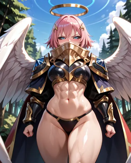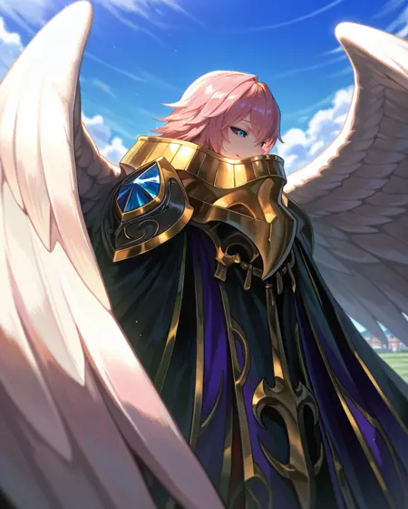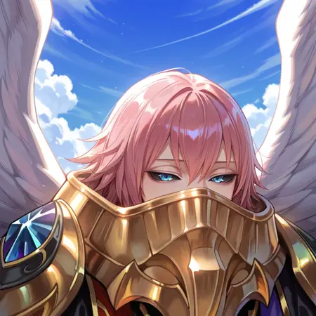 役立つタグ: 1boy, ピンクの髪, 青い目:0.2, 黒い白目:0.2, 翼, 天使の翼, 羽根の翼, アーマー, 肩アーマー, ローブ, マスク, 金縁, 口を覆う