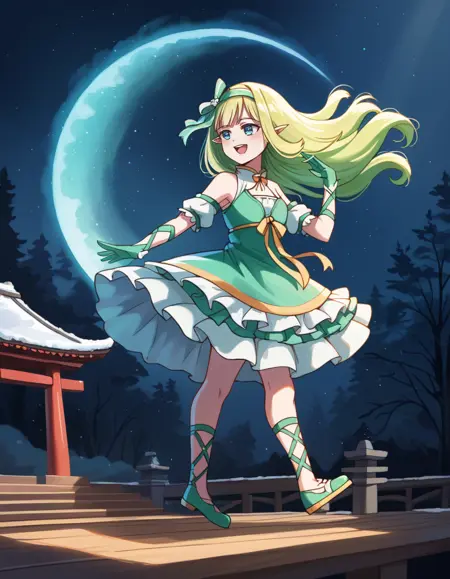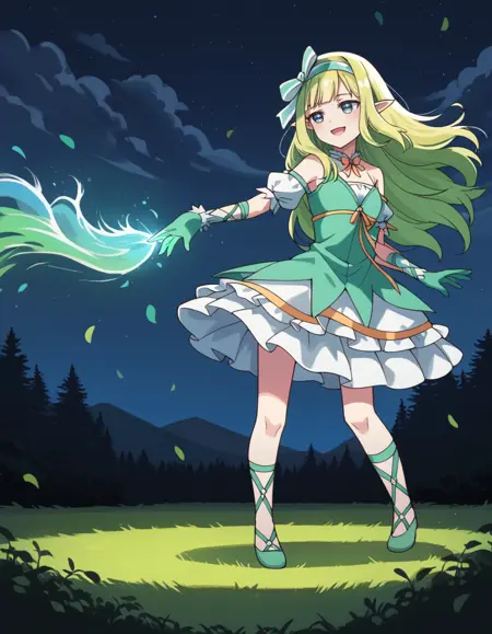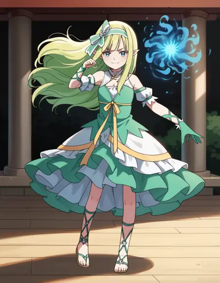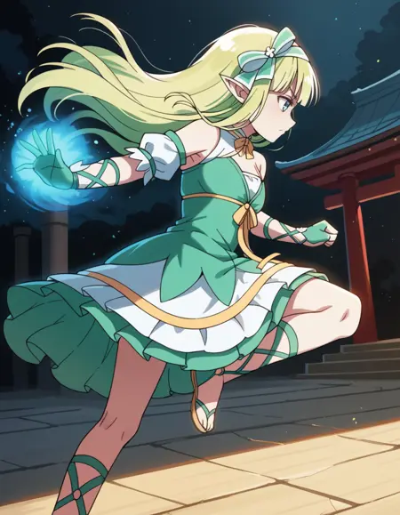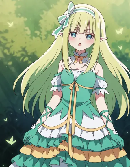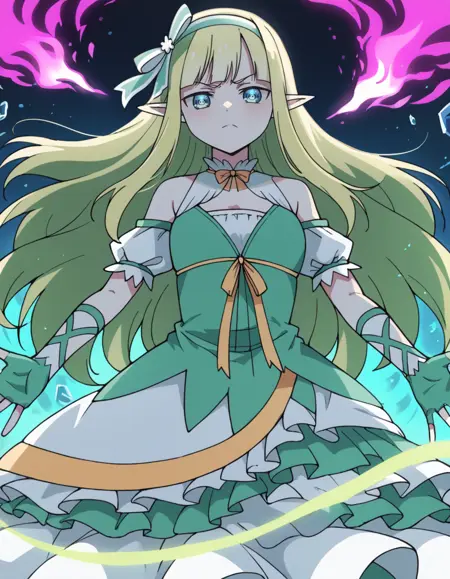 - orphia, long_hair, blonde_hair, blue_eyes, pointy_ears, elf, hairband, bow, bare_shoulders, ribbon, green_dress, gloves, detached_sleeves