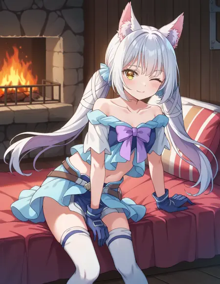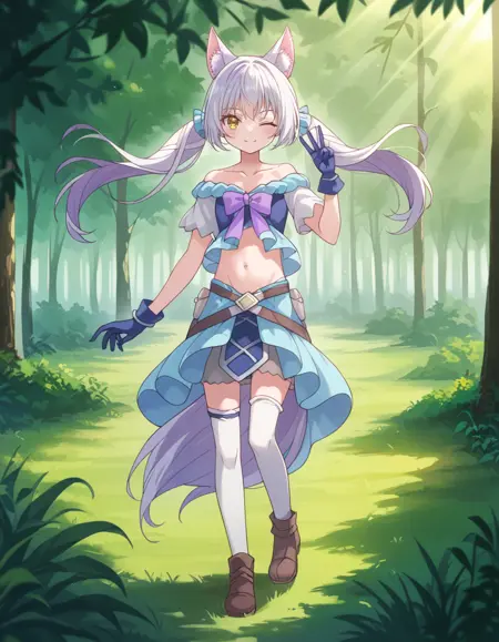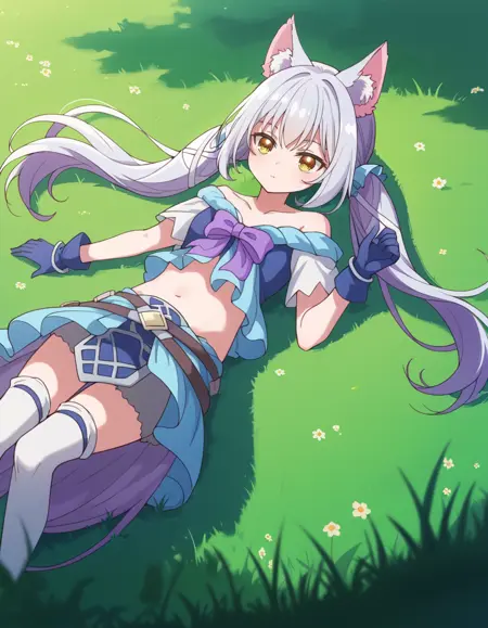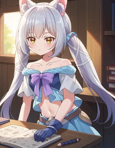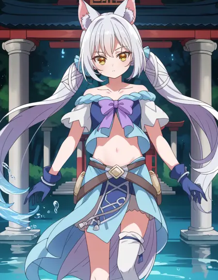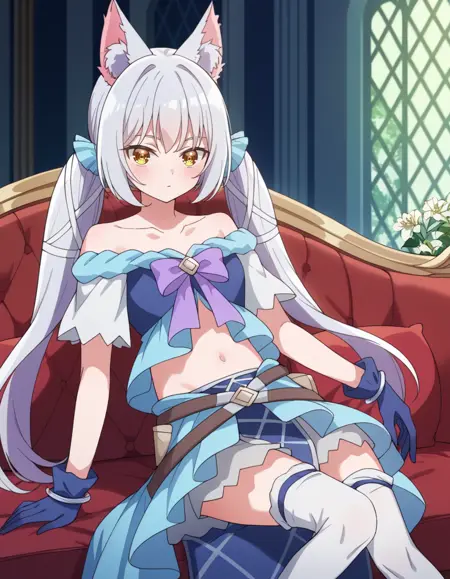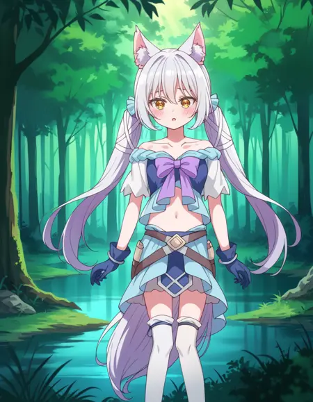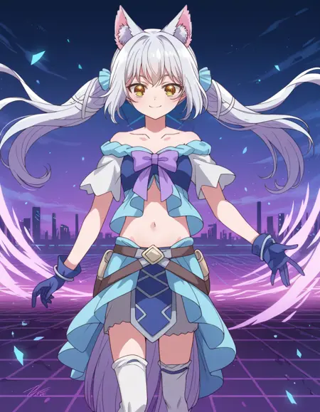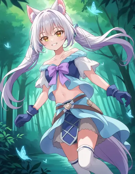 • sara, wolf_ears, yellow_eyes, white_hair, long_hair, twintails, animal_ear_fluff, collarbone, bow, gloves, bare_shoulders, midriff, thighhighs