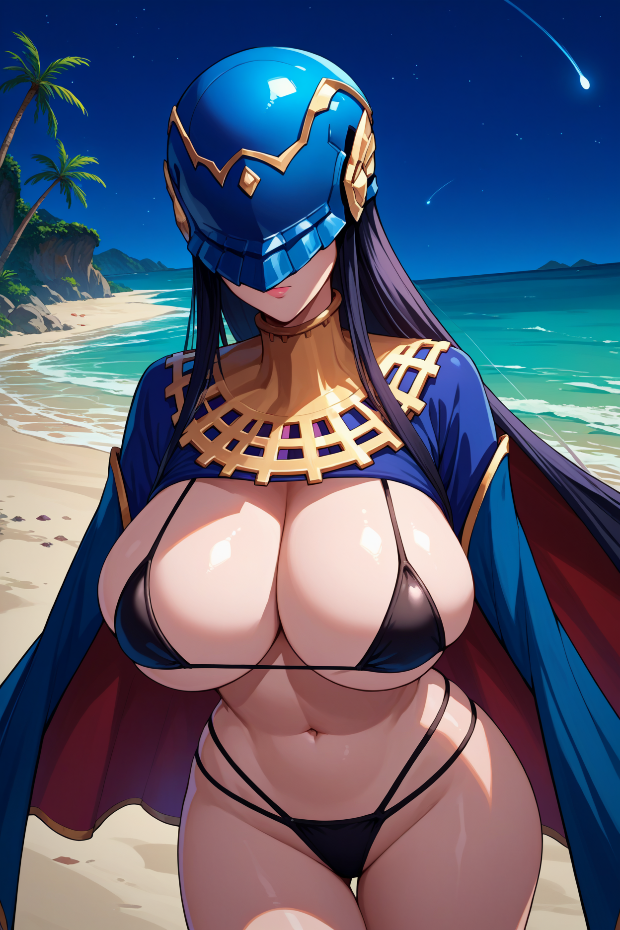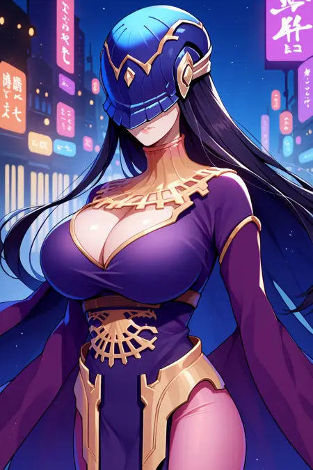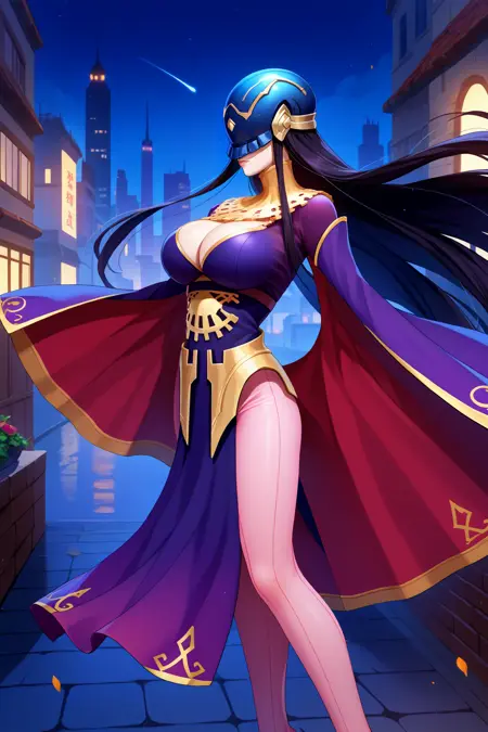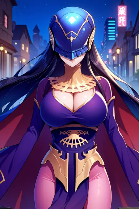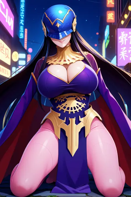 如需呈现她的典型造型,请添加 "斗篷,紫色连衣裙,胸脯露出,骨盆帘,粉红色连裤袜"。
