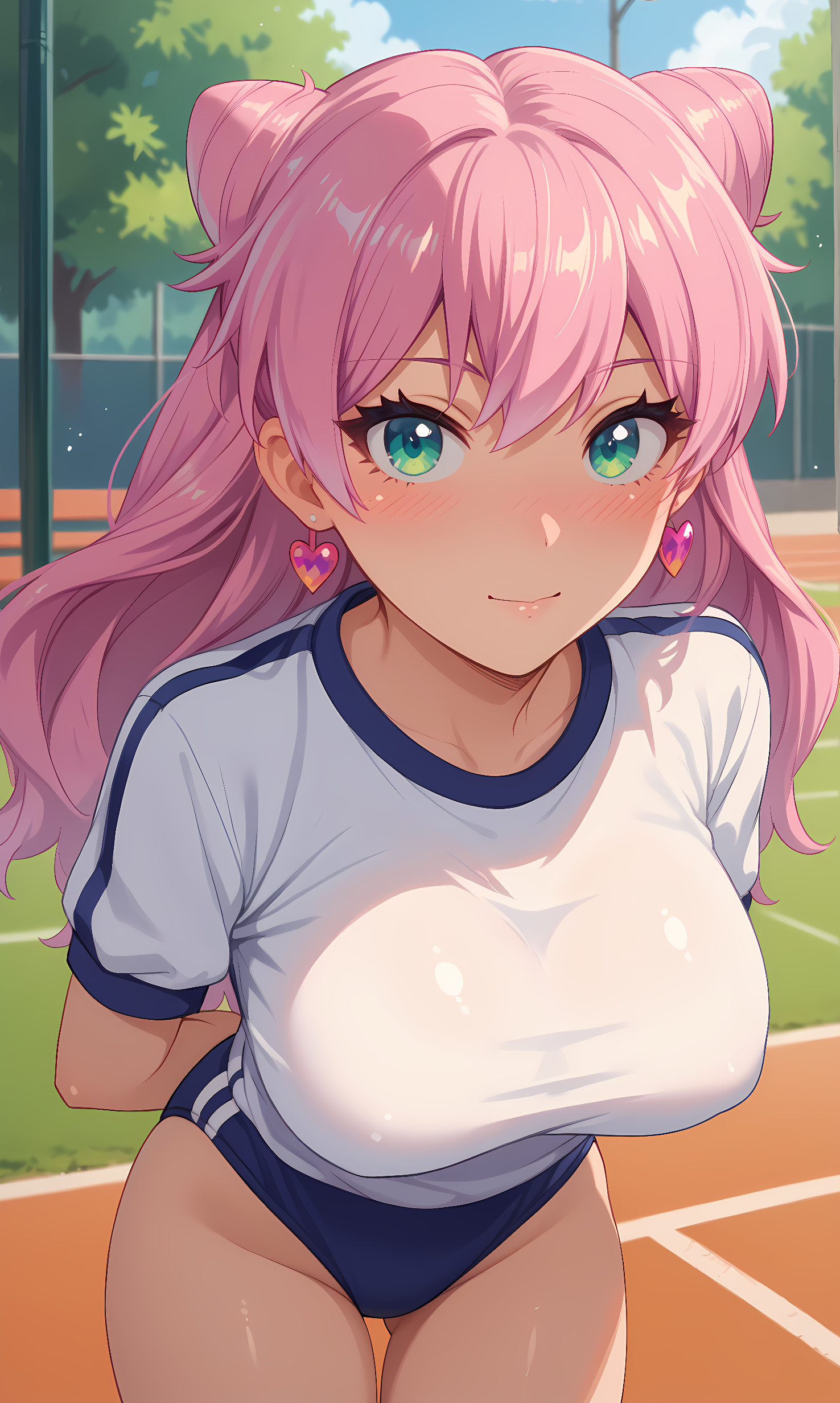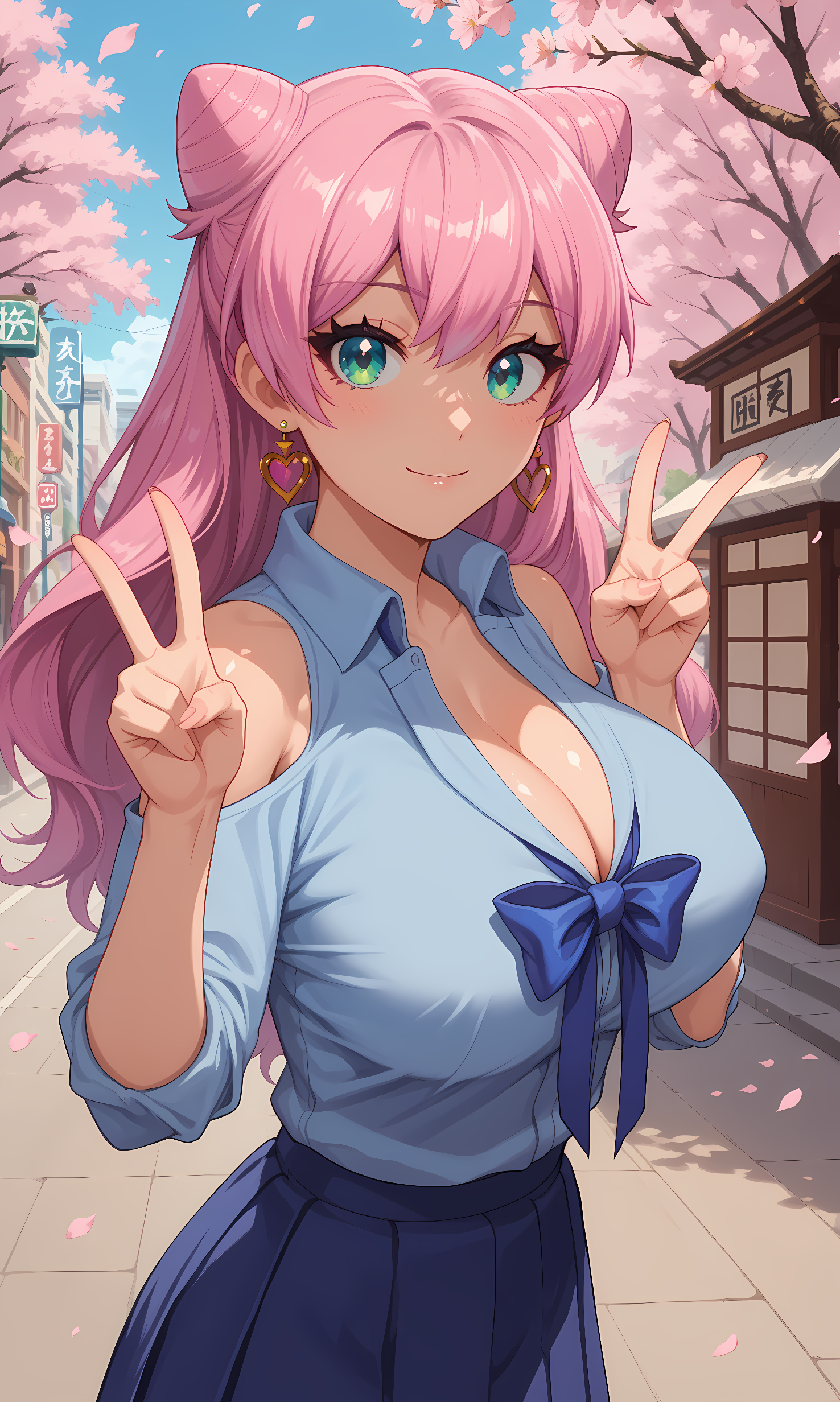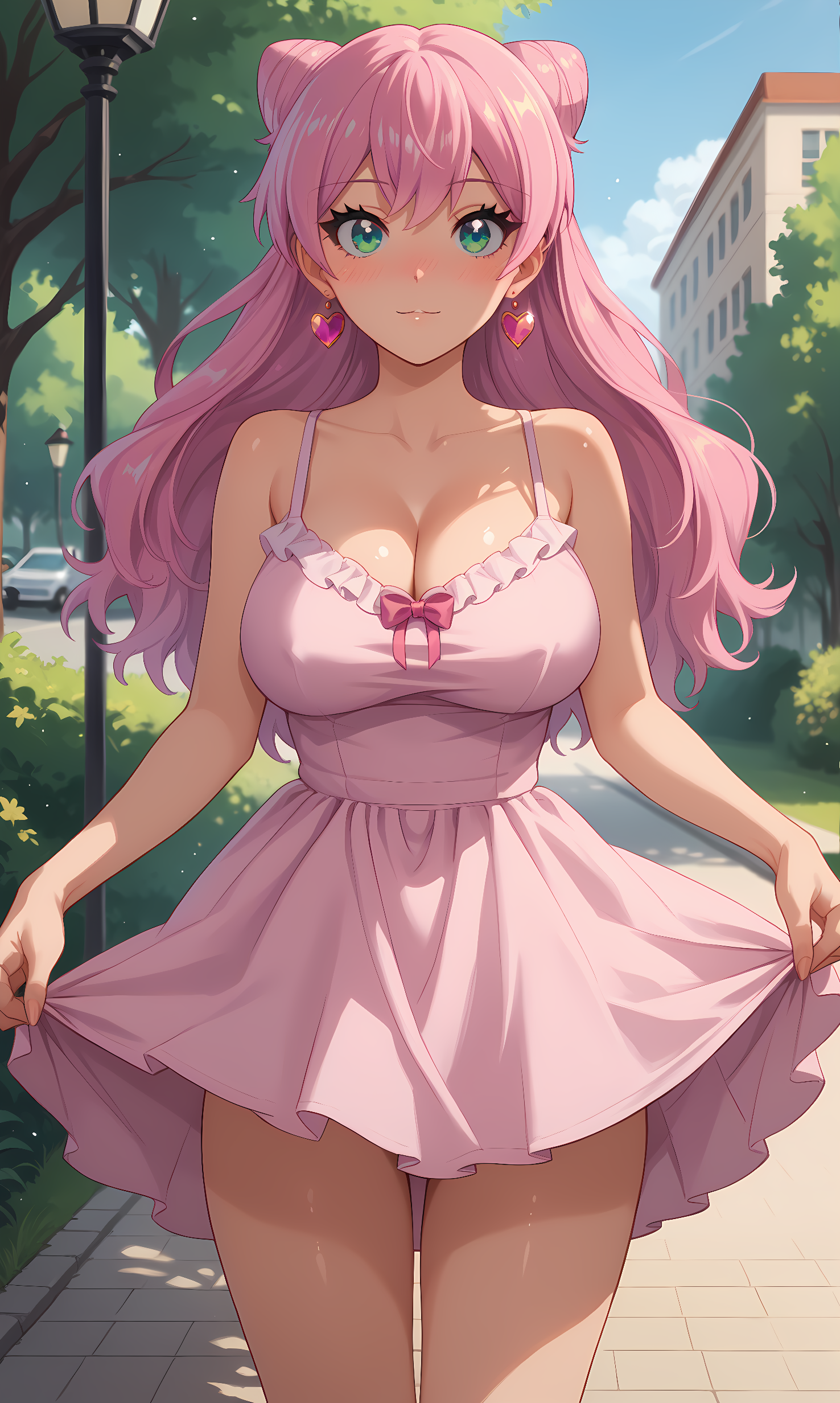 akari, 녹색 눈, 분홍색 머리, 긴 머리, 원뿔형 머리 뾰족한 단발, 더블 뾰족한 단발, 하트 귀걸이