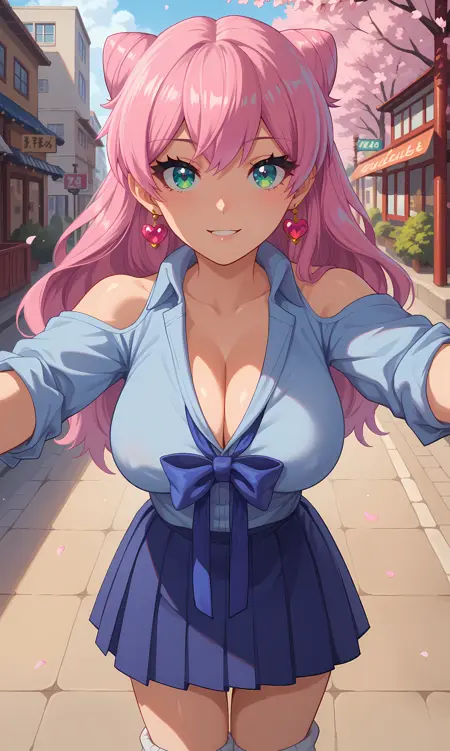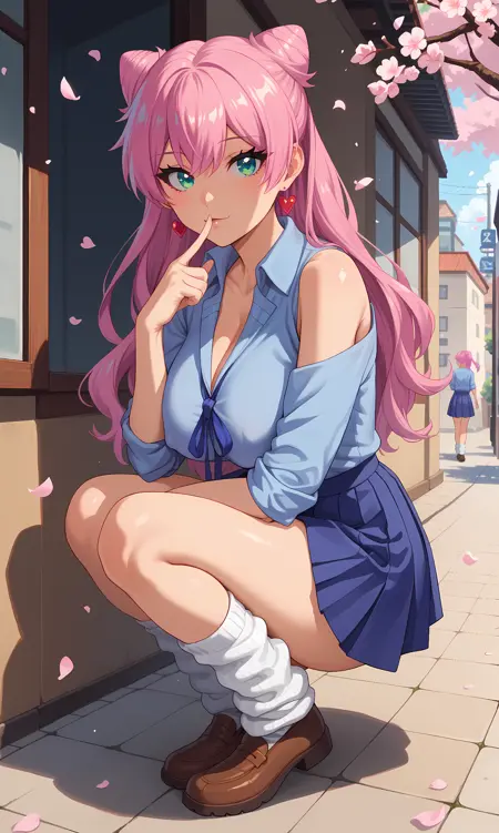 파란색 칼라 셔츠, 어깨 절개, 소매 말아 올리기, 가슴 노출, 파란색 리본, 풀린 리본, 파란색 치마, 주름 치마, 풀린 양말, 갈색 신발