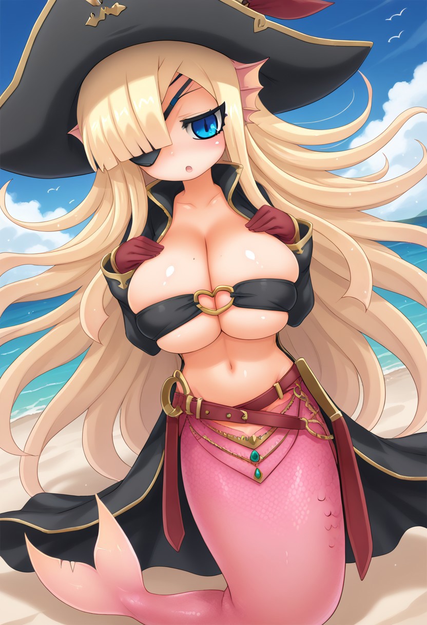 mgqbonnie,mermaid,blonde hair,blue eyes,pirate hat,pirate costume,large breasts,cleavage,navel,belt,red gloves,sword