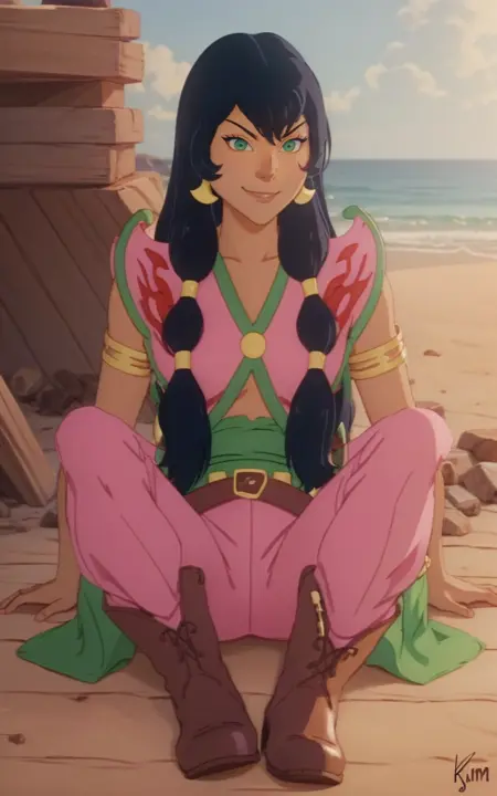 woman, a cartoon character with a black hair and pink outfit, green eyes, golden earrings, green sash, brown boots,