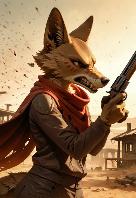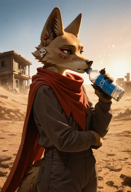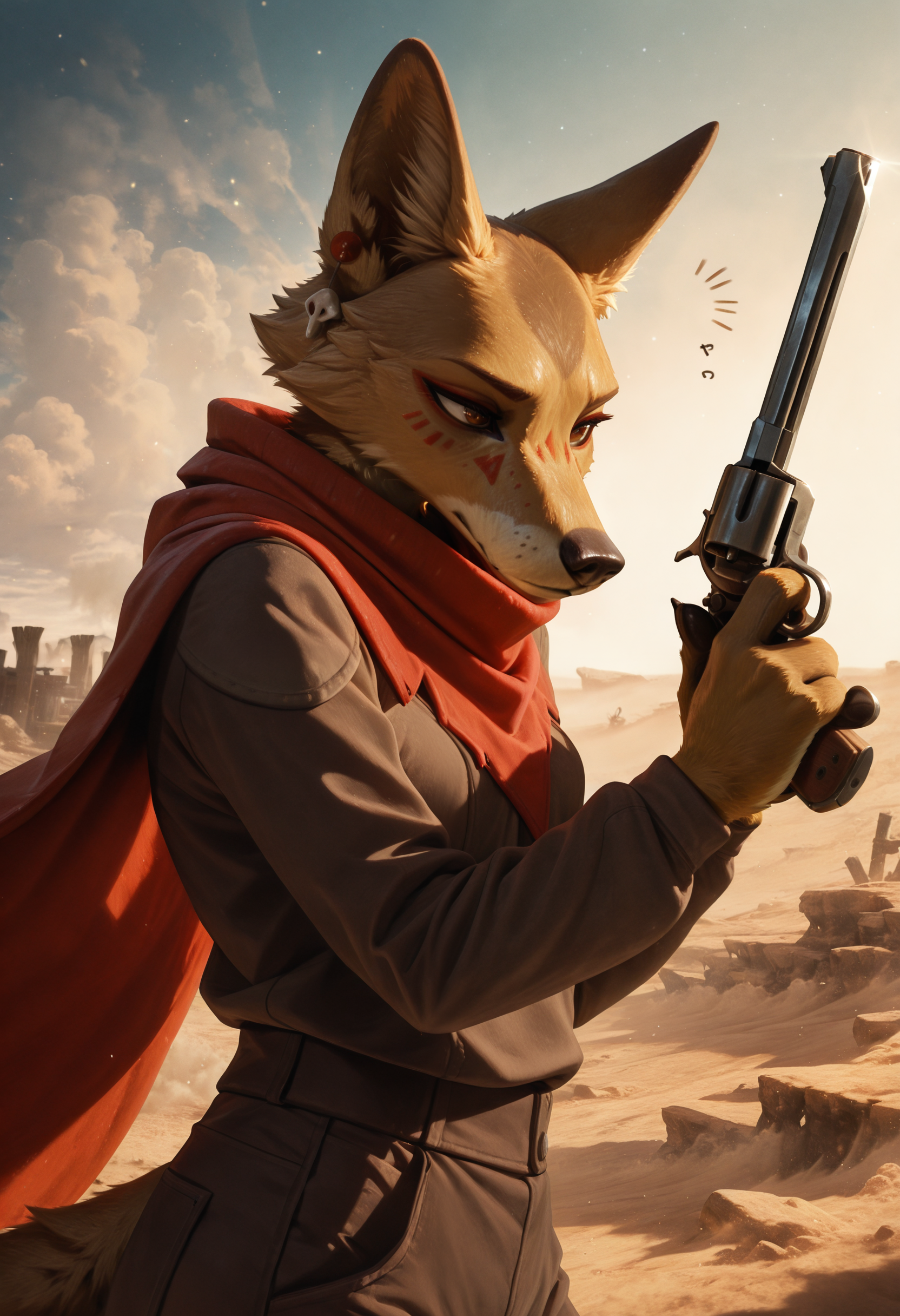 la1ka, 1girl, solo, coyote, furry, mammal, anthro, animal ears, tail, clothing, earrings, body fur, scarf, clothed, jewelry, red scarf, facial mark