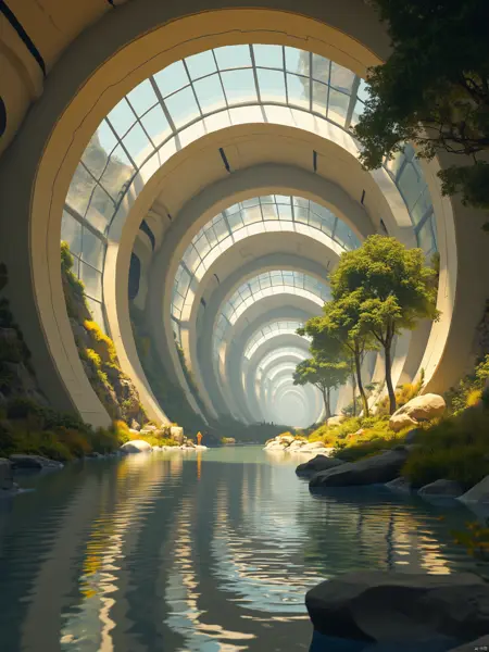 这是一个混合风格的LoRA,描述生态科技未来主义,主要聚焦于科幻题材。主色调多为黄色和绿色,建筑和物体以无法想象的方式呈现,不再受现实生活的限制。