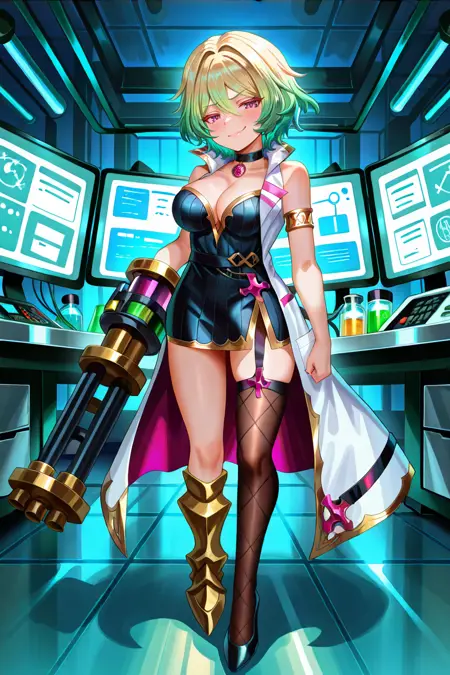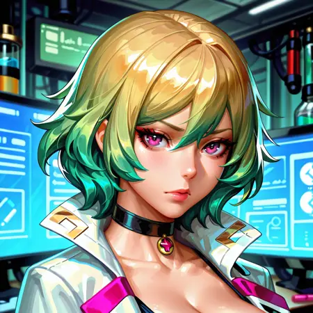 常用标签: 1girl,紫色眼睛,短发,渐变发色,黄发,绿发,领饰,黑色项圈,白大褂,实验服,翻领,翻领,微裙,黑裙,金边装饰,胸部显露,金色臂环,不对称腿饰,不匹配的裤装,臂炮,