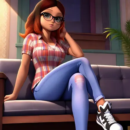 アリヤのトリガー:眼鏡、長い髪、茶色の目、シャツ、ジーンズ、白いスニーカー