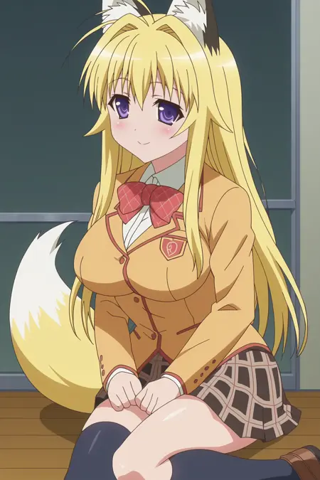 1girl, minamoto chizuru, kanokon, purple eyes, fox ears, fox tail, blonde hair, long hair, large breasts,