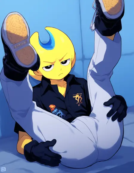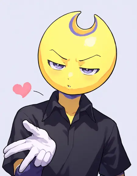 waynehylics, 1boy, solo, male focus, object head, colored skin, yellow skin, gloves, black shirt