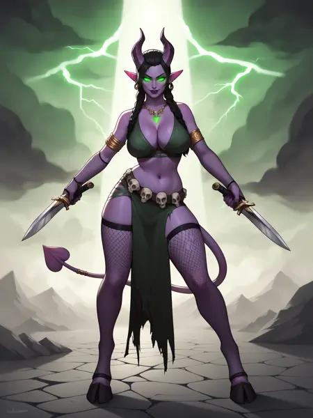 뿔, 꼬리, 발굽, 초록빛 빛나는 문신, 긴 머리, 팔찌, 발목걸이, 립스틱, 메이크업, 검은 아이섀도우, 보석류