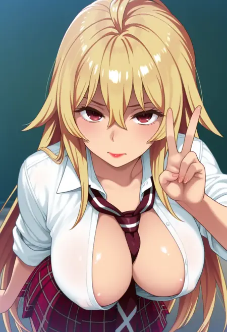 Shikishima Mirei, 빨간 눈, 금발, 긴 머리, 큰 가슴, 립스틱, ahoge, 빨간 치마, 체크 무늬 치마, 가슴 사이 넥타이, 흰 셔츠, 교복, 브래지어 없음