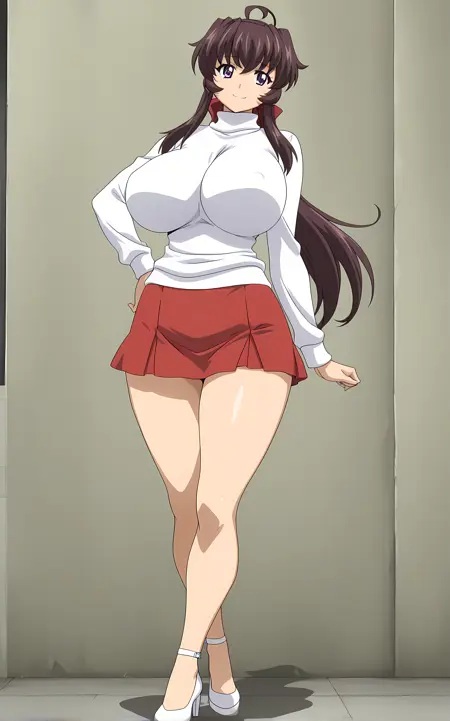 의상 태그: "흰색 스웨터, 터틀넥, 빨간 치마, 흰색 구두"
