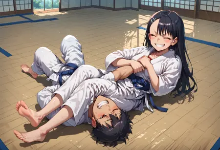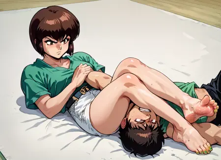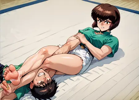 core_9, score_8_up, score_7_up, score_6_up, score_5_up, score_4_up, side perspective+ shot, armbar++, ((leglock )), femdom , 1girl, 1boy, brown+ hair, green top and shorts , femdom+, bob cut, nail polish, angry+, BREAK, 1boy black hair, male, arm between her thighs, straight arm, arm trapped, in pain, ((lying on floor)), fighting arena, submission hold ++, feet+, dojo gate, 1990s (style), sexy, high quality