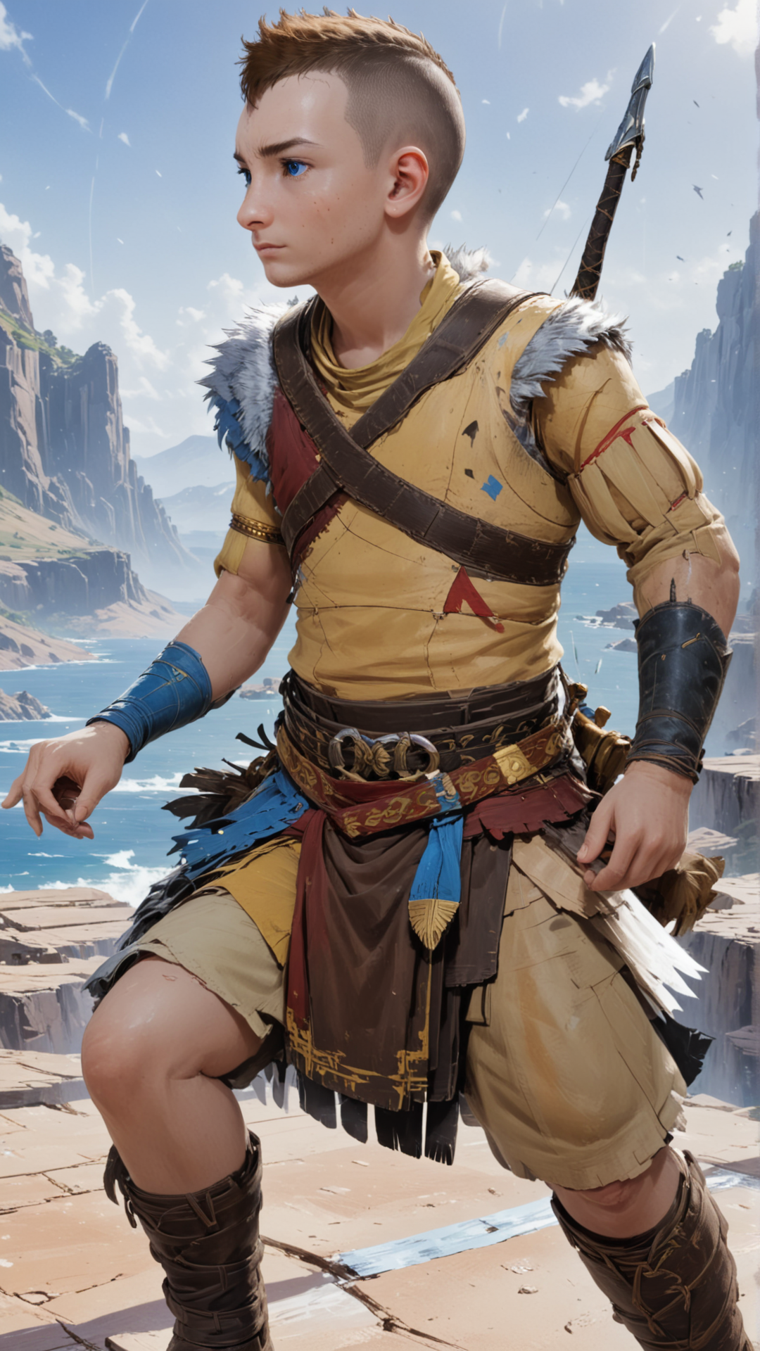 Example prompt: GoWRAtreus is a 14 year old boy with blue eyes and short brown buzzcut hair, with a little bit of a (mohawk:0.5) hairstyle. GoWRAtreus is wearing a yellow tunic with leather details. Belts and straps crossing his body. His waistcloth is red and blue and he is wearing brown leather boots. His right arm is bare and has a tattoo.