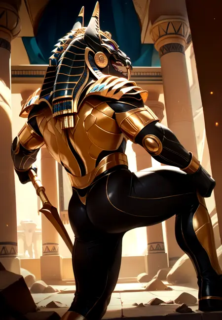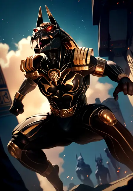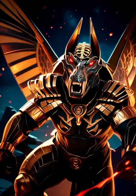 第三组来自最终战斗场景:赛特、埃及神战、肌肉发达、机器人、机甲、流线型金属身体、发光的红色眼睛、增强型身体、翅膀、夜晚。当然,若在战斗中翅膀被移除,可删去“翅膀”一词;同理,若赛特在某些场景中飞行,可加入“飞行”一词。
