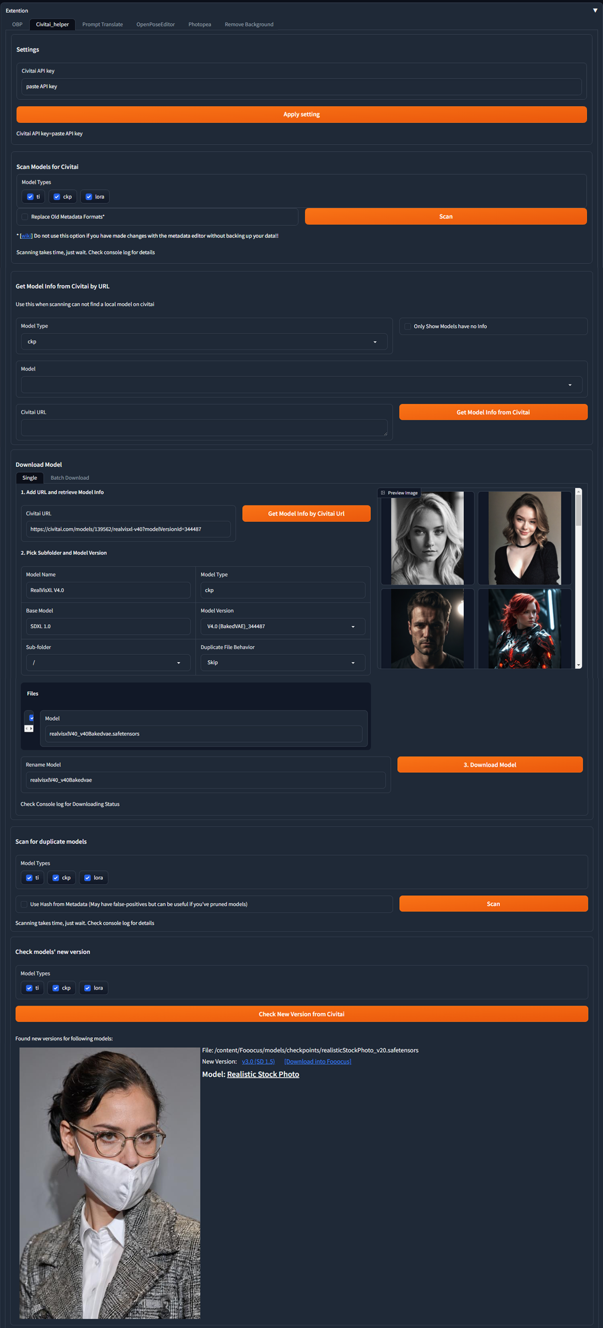 This extension allows you to download models for generation from the civitai website. To download a model you first need to specify your Civitai_API_key. In the Download Model section in the Civitai URL field you need to specify a link to the required model from the browser address bar and click Get Model Info by Civitai URL. After analysing the link you will be given information about the model. You will also be able to select the version of the model before downloading. This extension also allows you to find duplicates of downloaded models and check for updates. In addition, there is a group download option.
