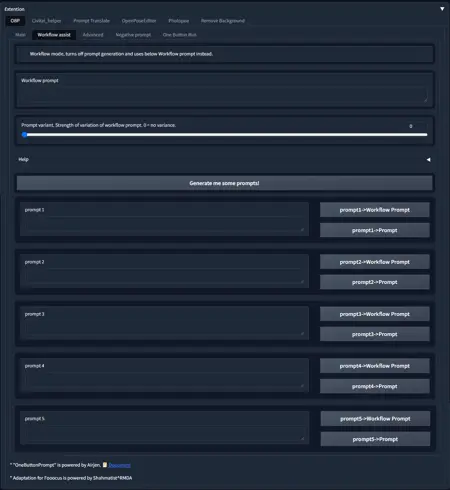 In the ‘Workflow assist’ tab you can generate 5 prompts, transfer each of them to the Fooocus prompt field and also to the Workflow field. If you select Workflow mode, it will generate not a new prompt, but variations of the prompt specified in the Workflow text field. The level of variation is selected by the engine located just below it