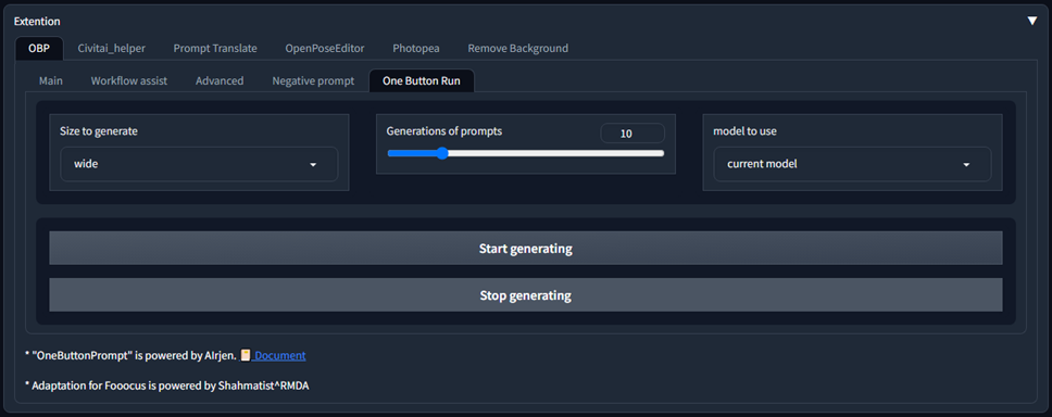 - OneButtonPrompt - allows you to generate prompts, generate variations of your prompt and runs to generate images from them. I will not dwell on the detailed description of this module - I will only point out the main functions