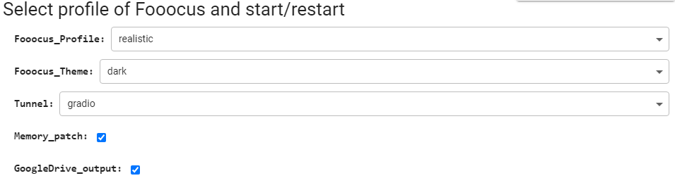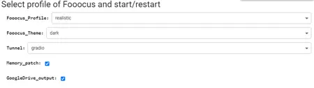 Before launching you are offered to choose the following settings Fooocus Profile - select which profile will be loaded at startup (default, anime, realistic). Fooocus Theme - select a theme - light or dark. Tunnel - select launch tunnel. When it happens that gradio stops working for some reason, you can choose cloudflared tunnel. However, the generation is a bit slower Memory patch - adds a few keys to the launch bar that allow you to optimise your graphics card if you are using the free version of Google Colab. If you have paid access, this item can be disabled GoogleDrive output - connects your GoogleDisk and save all of your generation directly to it.