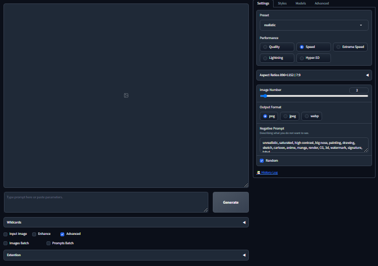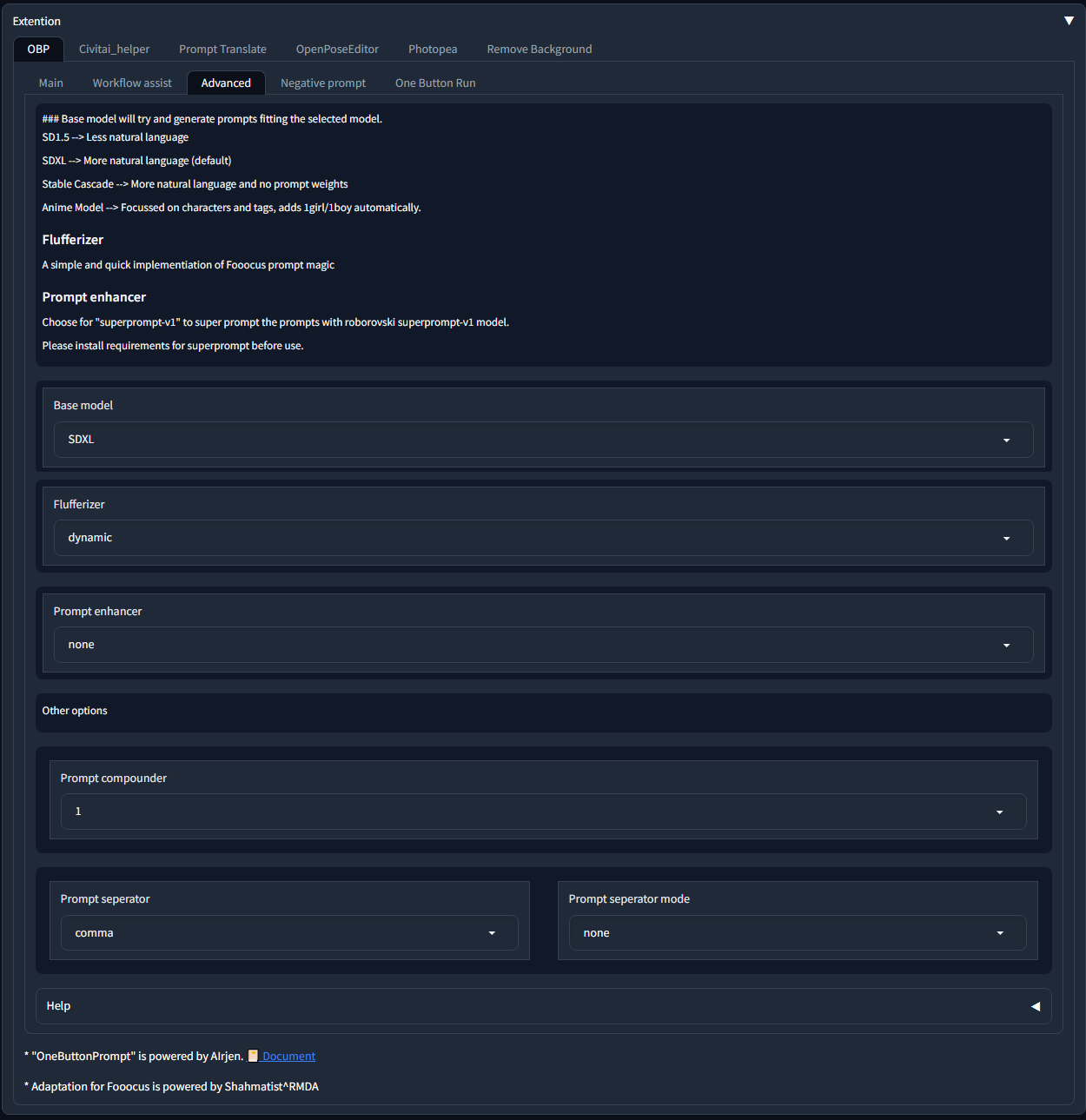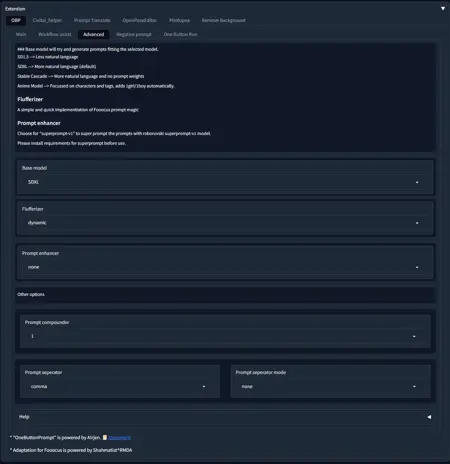 In this tab you can select the prompt syntax for different generation models, the length of the prompt, and enable the prompt generation enhancer.