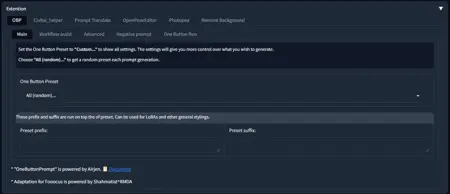In the ‘Main’ tab, you can select the preset of the prompt generation theme, as well as specify unchanging prompt prefixes and suffixes.