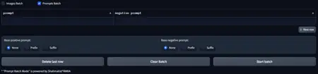This module allows you to start generating several prompts in the queue for execution. To do this, you need to fill in the table In the prompt column enter a positive prompt, and in the negative prompt column enter a negative prompt respectively. Clicking on New row will add an empty row to the end of the table. Delete last row deletes the last row of the table. Start batch starts execution of the prompt queue for generation. You can also choose to add base positive and negative prompts. None - basic prompts will not be added. Prefix - base prompts will be added before prompts from the table. Suffix - base samples will be added after samples from the table.