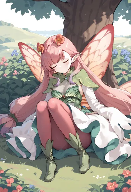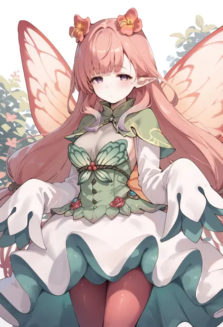 그녀의 전형적인 외모를 위해 "나비 날개, 분리된 소매, 카프렛, 소매 없는 드레스, 스타킹, 부츠, 아래로 묶인 긴 머리"를 추가하세요.