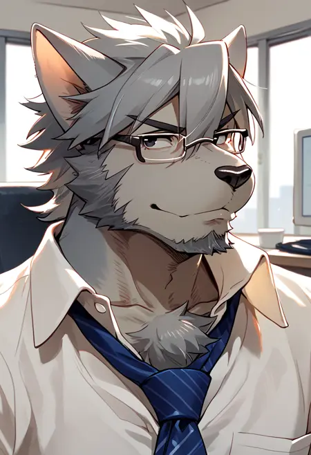 Pony: score_9, score_8_up, score_7_up, score_6_up, score_5_up, score_4_up, mitsuhisa_aotsuki, morenatsu, facial hair, grey body, two-tone body, black eyes, glasses, blue tie, white shirt, ...your tags...