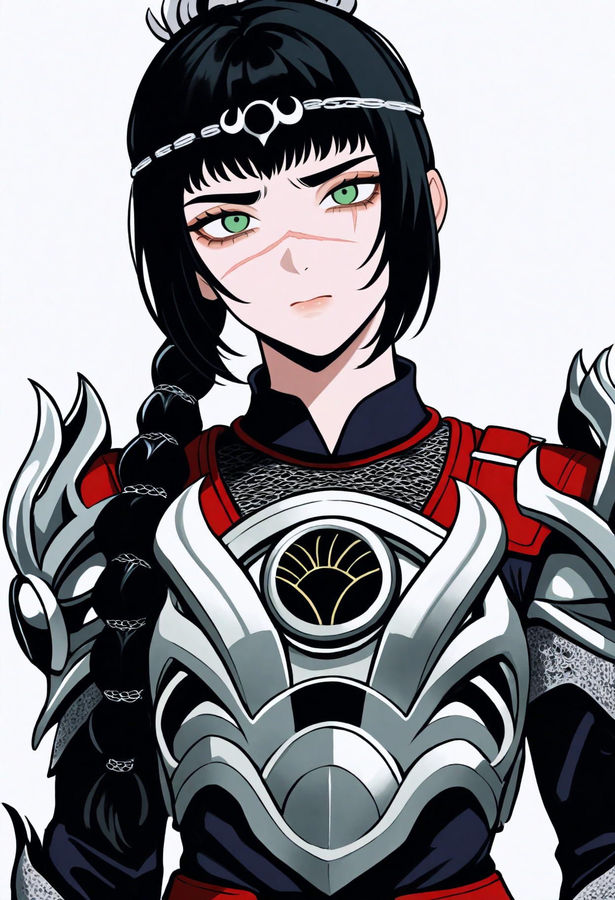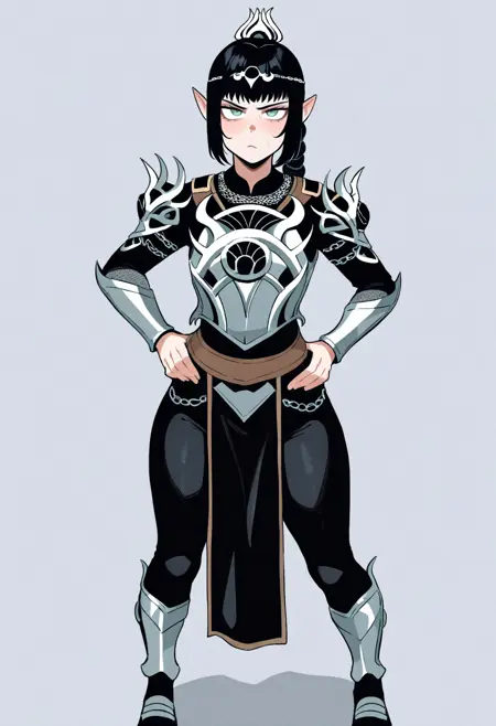 Shadowheart prompts : 1girl, shadowheart, black hair, circlet, long hair, braided ponytail, braid, green eyes, elf, pointy ears, armor