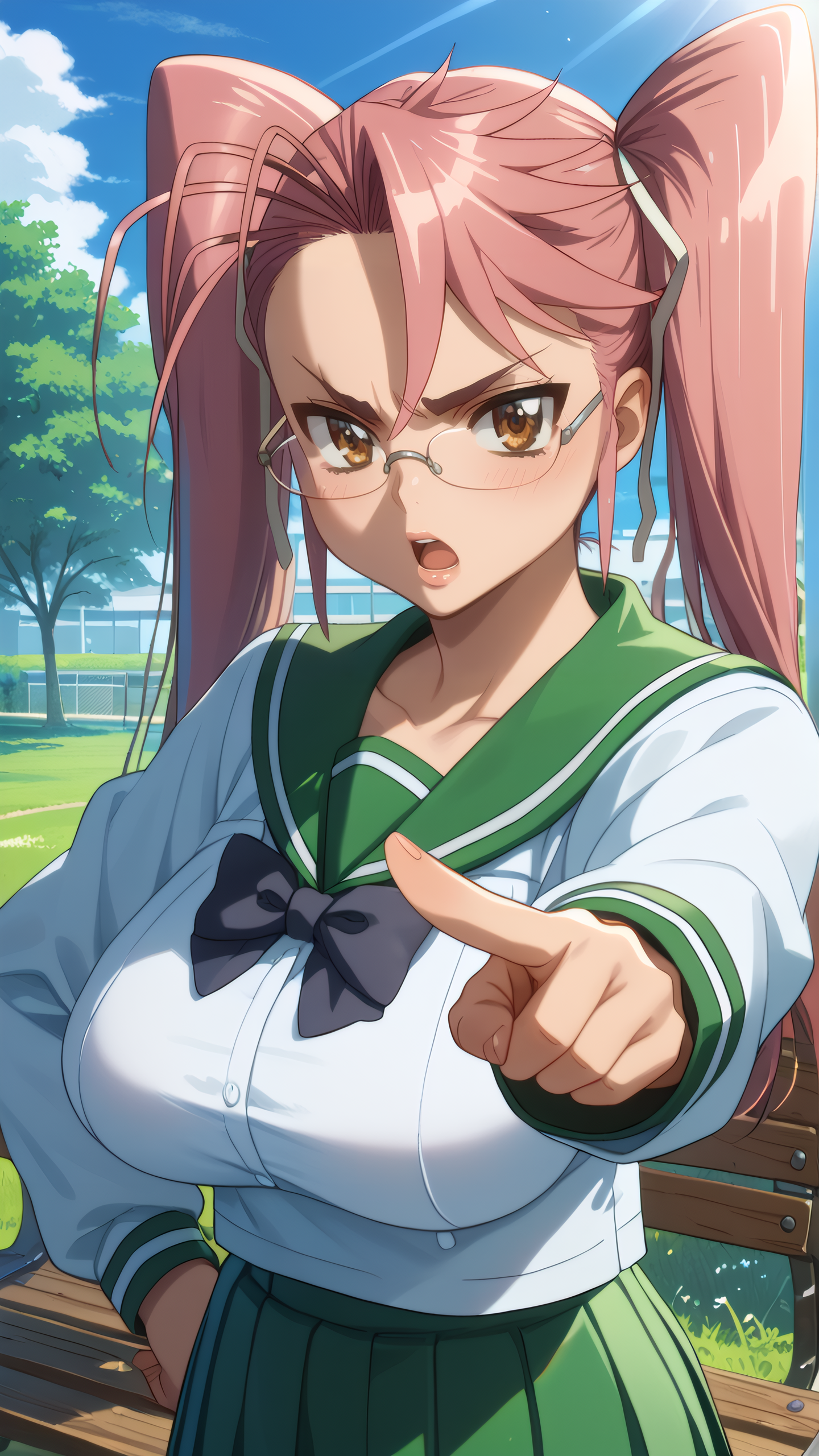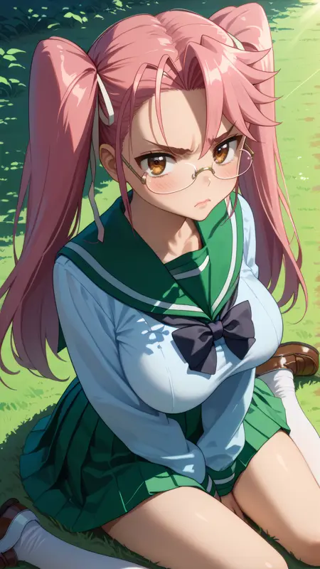 saya_takagi, pink hair, brown eyes, long hair, twintails, glasses, hair ribbon, school uniform, serafuku, green skirt, pleated skirt, black bowtie, long sleeves,