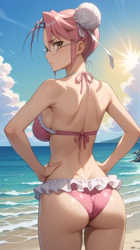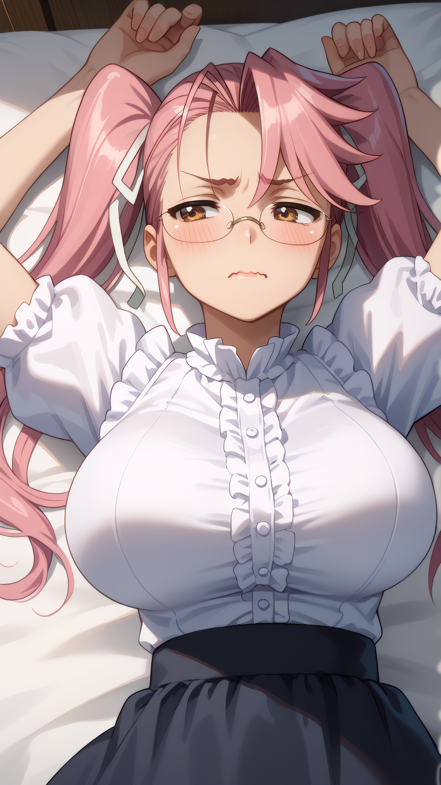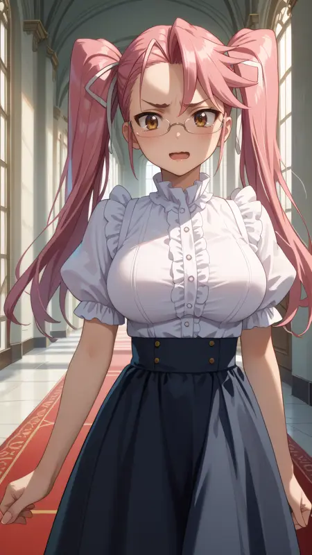 saya_takagi, pink hair, brown eyes, long hair, twintails, hair ribbon, glasses, frilled shirt, white shirt, black skirt, puffy short sleeves, center frills,