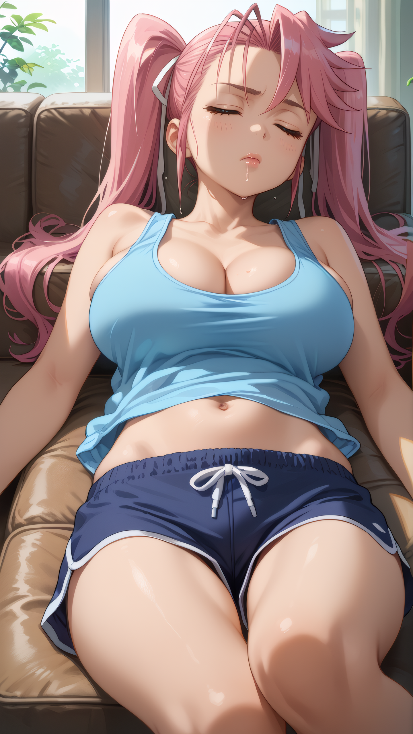 saya_takagi, pink hair, brown eyes, long hair, twintails, hair ribbon, blue tank top, loose clothes, sportswear, black shorts, short shorts, cleavage, sleeveless, midriff, navel,
