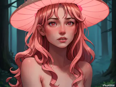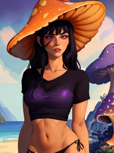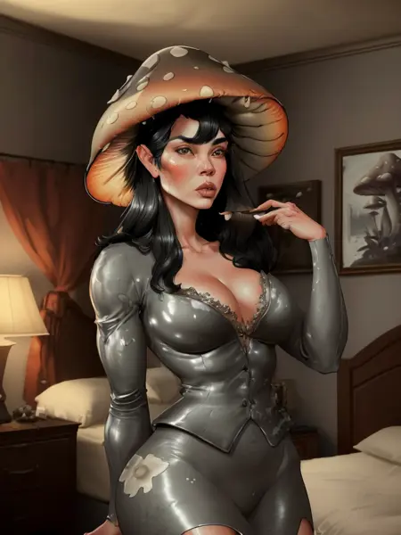 正面提示: lora:mushroomPeoplev120:0.75(mush_woman, blue mushroom)