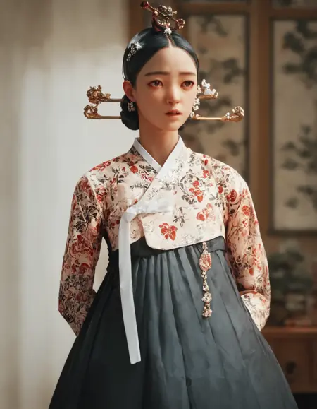 • "patterned"、"patterned hanbok" 和 "patterned skirt" 会避免纯色设计,但效果不稳定,常在肩部和胸部生成당의(dangui)图案