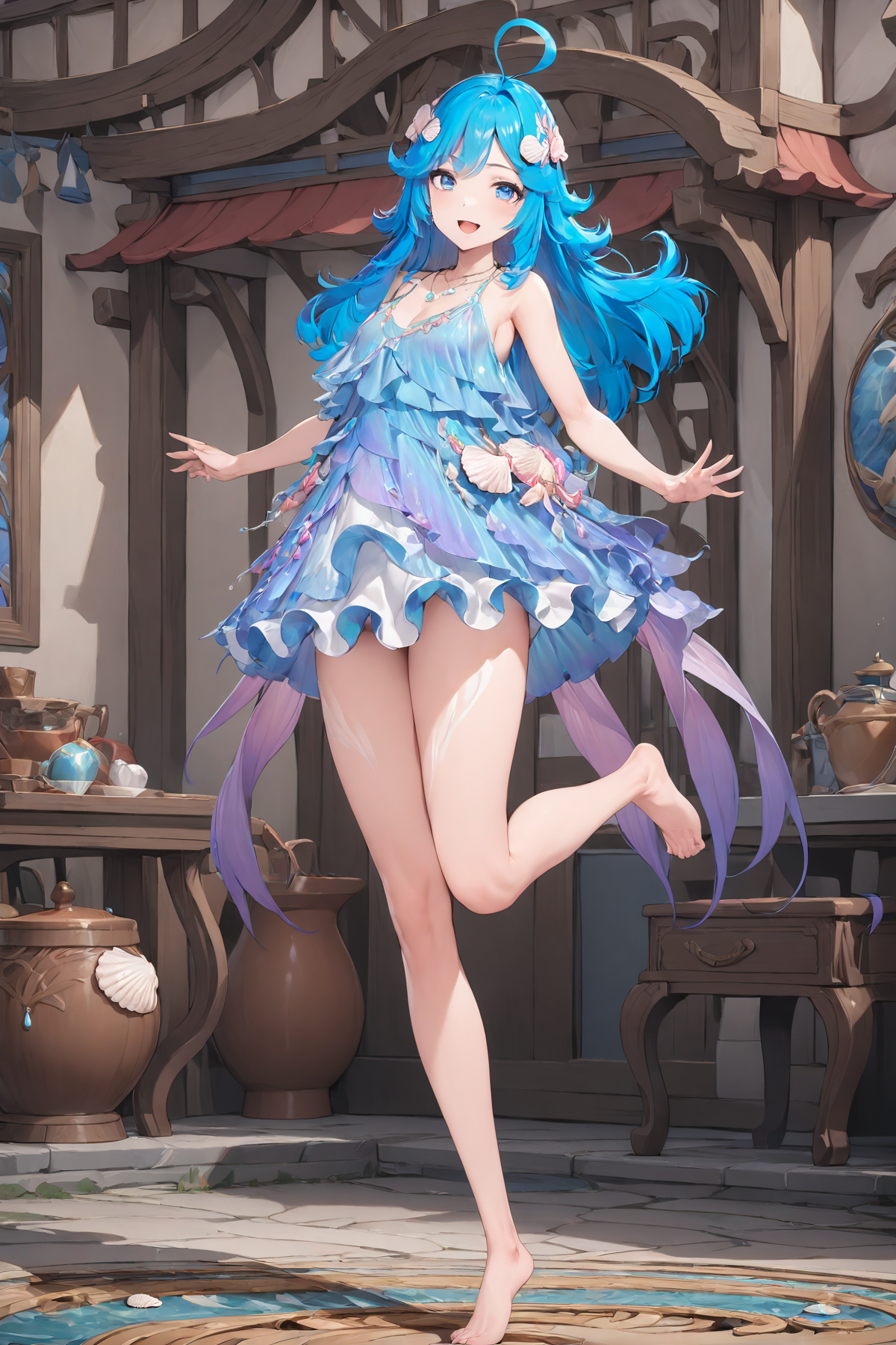 , blue eyes, shiny hair, barefoot, blue dress, gradient, shell hair ornament, ahoge, <lora:Duoliya_xl:0.8>
