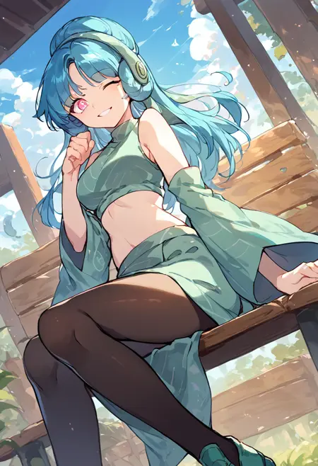 senya_angler,blue hair,long hair,pink eyes,(+_+,pupils sparklings:1.2),crop top,detached sleeves,kimono,furisode,skirt,midriff,black pantyhose,green footwear,
