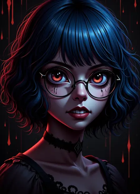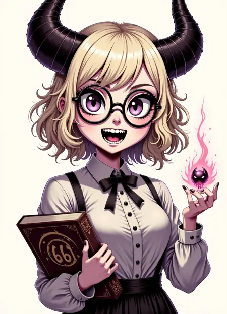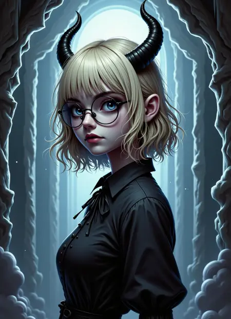 Try any flat 2d digital drawing, mad young woman, short, wavy, platinum blonde air, teeth, glasses, horns, dark creepy related trigger words to get most out of it. :)