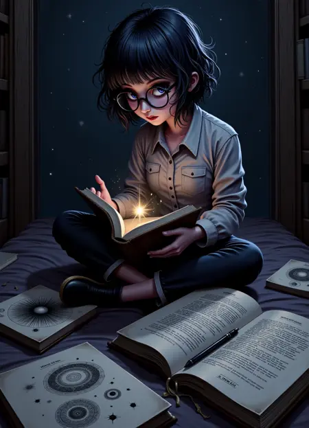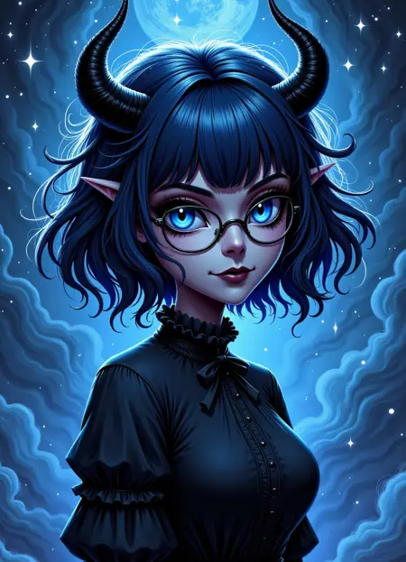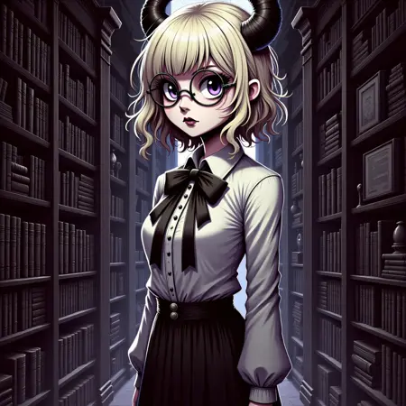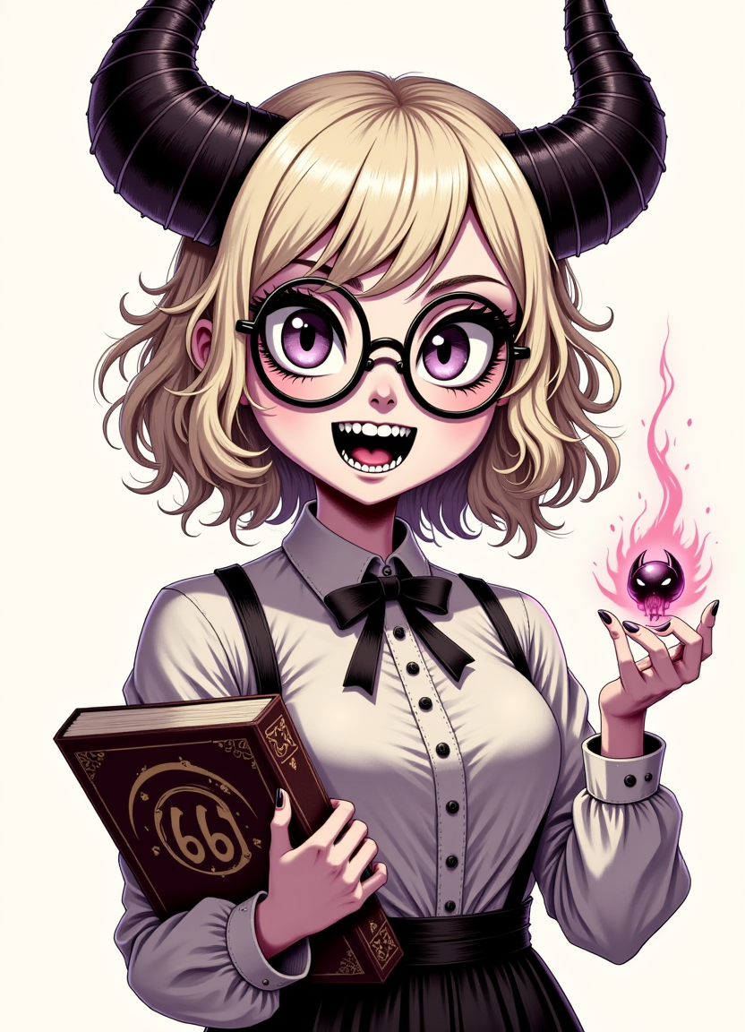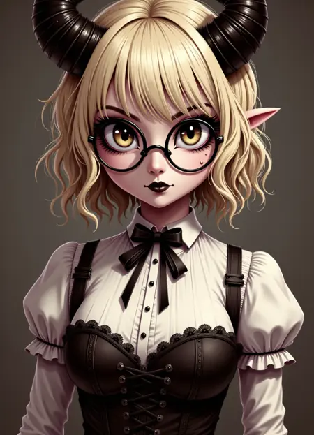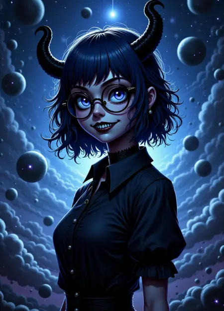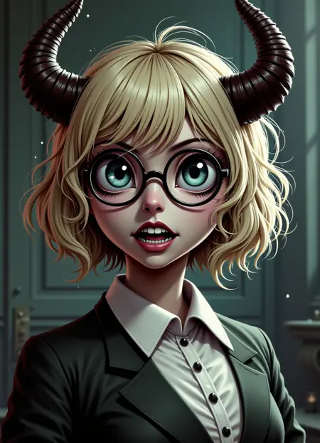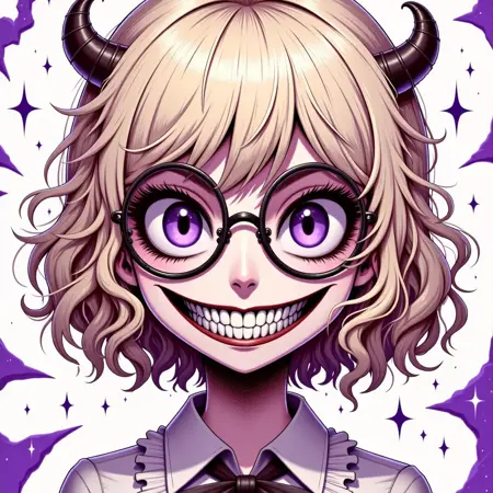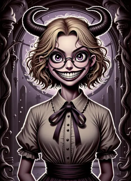 尝试任何扁平的二维数字绘画,加上“疯狂的年轻女性”、“短发”、“波浪状”、“铂金色发丝”、“牙齿”、“眼镜”、“角”、“黑暗诡异”等相关触发词,以获得最佳效果。 :)