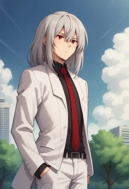 koujibu, 1boy, male focus, solo, grey hair, long hair, red eyes, formal, suit, white suit, shirt, collared shirt, black shirt, necktie, red necktiem, jacket, white jacket, pants, white pants, belt, shoes, black footwear,
