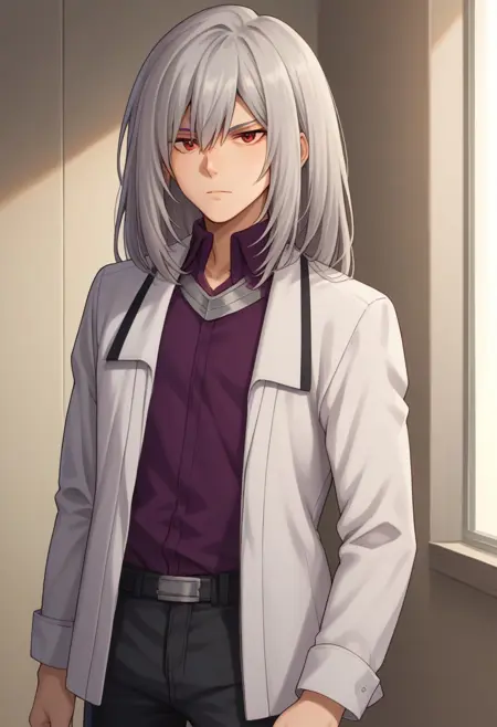 koujibu, 1boy, male focus, solo, grey hair, long hair, red eyes, shirt, collared shirt, purple shirt, jacket, white jacket, open jacket, open clothes, pants, black pants, shoes