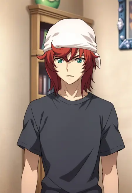 사토루, 1남자, 남성 중심, solo, 붉은 머리, 단발, 녹색 눈, 셔츠, 흰색 셔츠, 칼라 셔츠, 조끼, 보라색 조끼, 바지, 신발,