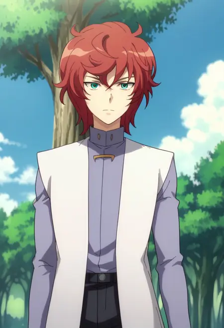 사토루, 1남자, 남성 중심, solo, 붉은 머리, 단발, 녹색 눈, 재킷, 흰색 재킷, 소매 없는 재킷, 셔츠, 보라색 셔츠, 긴 소매, 바지, 검은 바지, 신발, 갈색 신발,